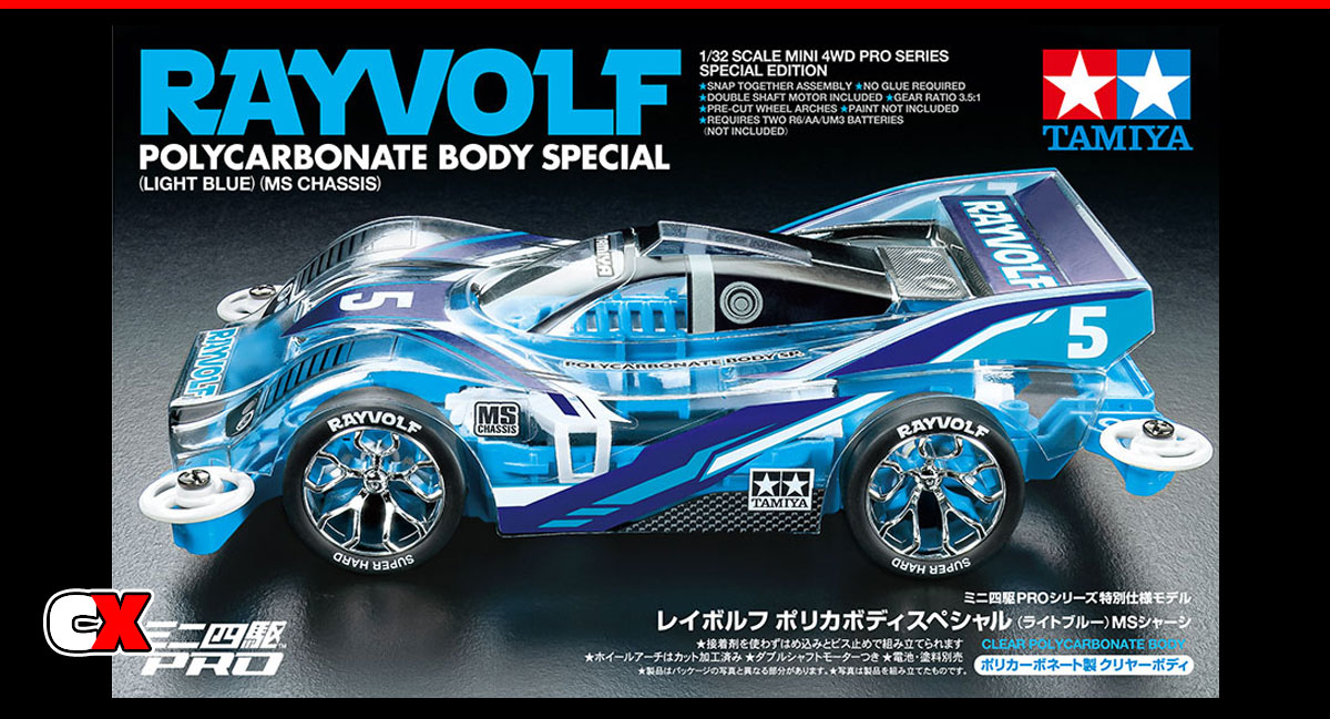Tamiya is adding the Rayvolf Light Blue Special Edition Mini 4WD to their line up. This kit continues with the MS Chassis but now includes a ‘speed-oriented’ clear polycarbonate body set. The chassis components are molded in a special edition blue.