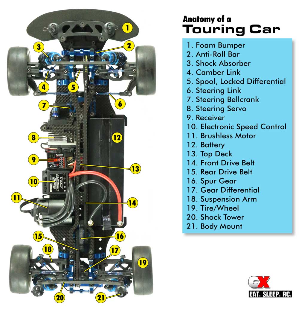 Let’s take a look at the anatomy of a belt-driven touring car. To learn about using some of these options for tuning, check out our RC Suspension Tuning Guide.