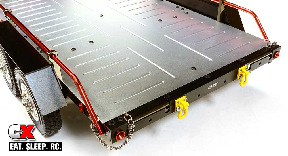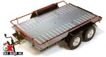 Integy has released this amazing flatbed trailer designed to hook to the back of your car, truck or crawler. It’s big enough to haul around vehicles like an Axial SCX10, measuring aound 400x250mm. It comes with a leaf-spring suspension, 1.9″ wheels and tires, a working retractable stand, alloy fenders and alloy ramps that pull out for loading and retract under when moving. A toolbox enclosure up front houses the battery and switch to turn the running and brakes lights on and off.