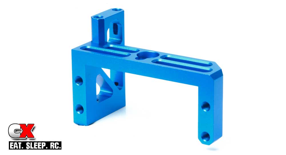 The second piece is an aluminum servo mount designed to replace the plastic kit mount. It’s alloy construction reduces servo flex for a more positive steering feel. It can be mounted like the original (near the centerline of the chassis) or with an optional mount point that also connects it to the raised chassis frame. Love the blue anodized finish!